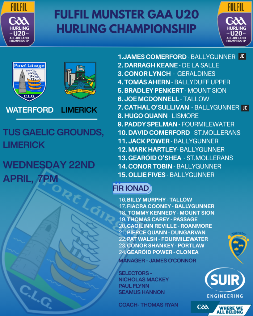 James O’Connor and his management team have announced the team to play Limerick in the Fulfil Munster GAA U20 Hurling Championship on Wednesday the 22nd of April in the TUS Gaelic Grounds.