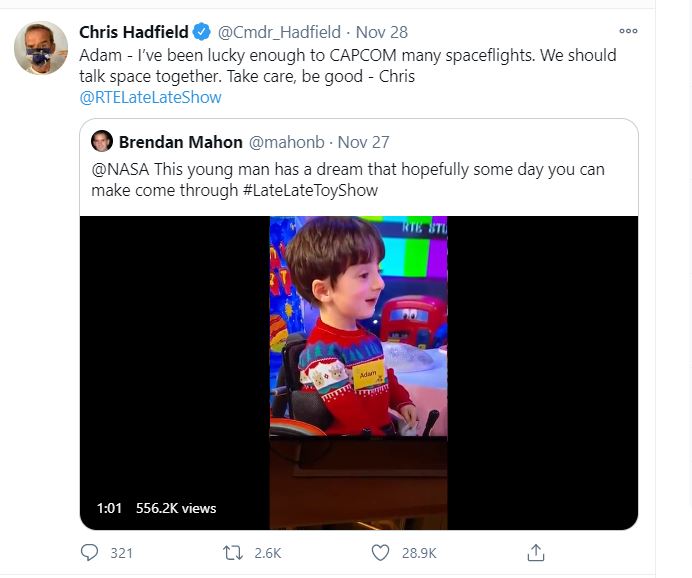 Adam captured the attention of some of the big names at NASA, including Chris Hadfield, who tweeted that he’d love to chat to the little boy…